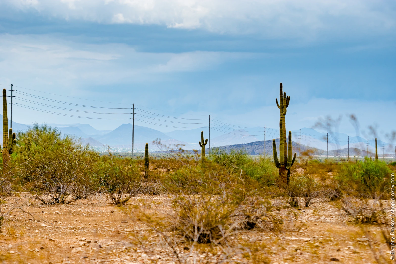 This is a classic Arizona landscape captured in Peoria, Arizona, USA, in August 2014. The composition highlights the iconic Saguaro cacti and desert scrub against a backdrop of distant mountains and a cloudy sky, showcasing the unique beauty of the Sonoran Desert.