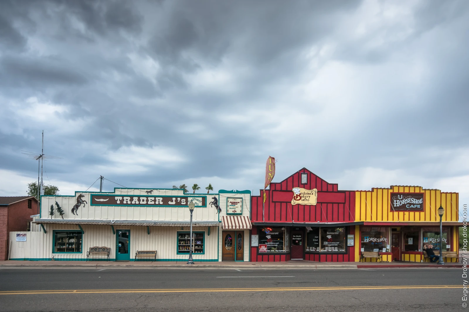 In Wickenburg, Arizona, USA, August 2014, the storefronts of Trader J's, Bedoian's Bakery & Bistro, and Horseshoe Cafe stand as a testament to classic American commerce. This collection captures the essence of these Arizona spaces, showcasing their unique architectural styles and vibrant signage.