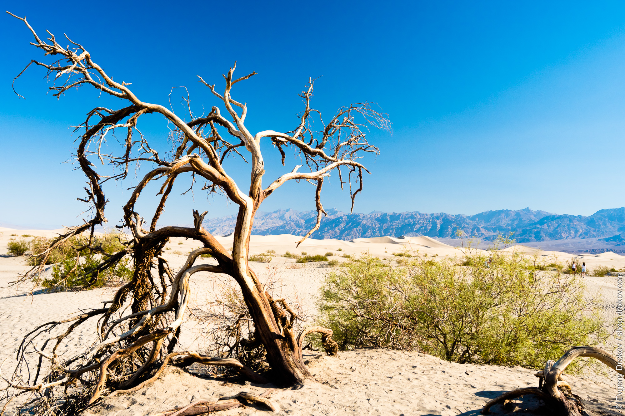 A stark, dead mesquite tree stands sentinel against the vast expanse of the Mesquite Flat Sand Dunes in Death Valley, California. Captured in August 2014, this composition highlights the enduring beauty of the desert landscape and the resilience of life in extreme conditions.