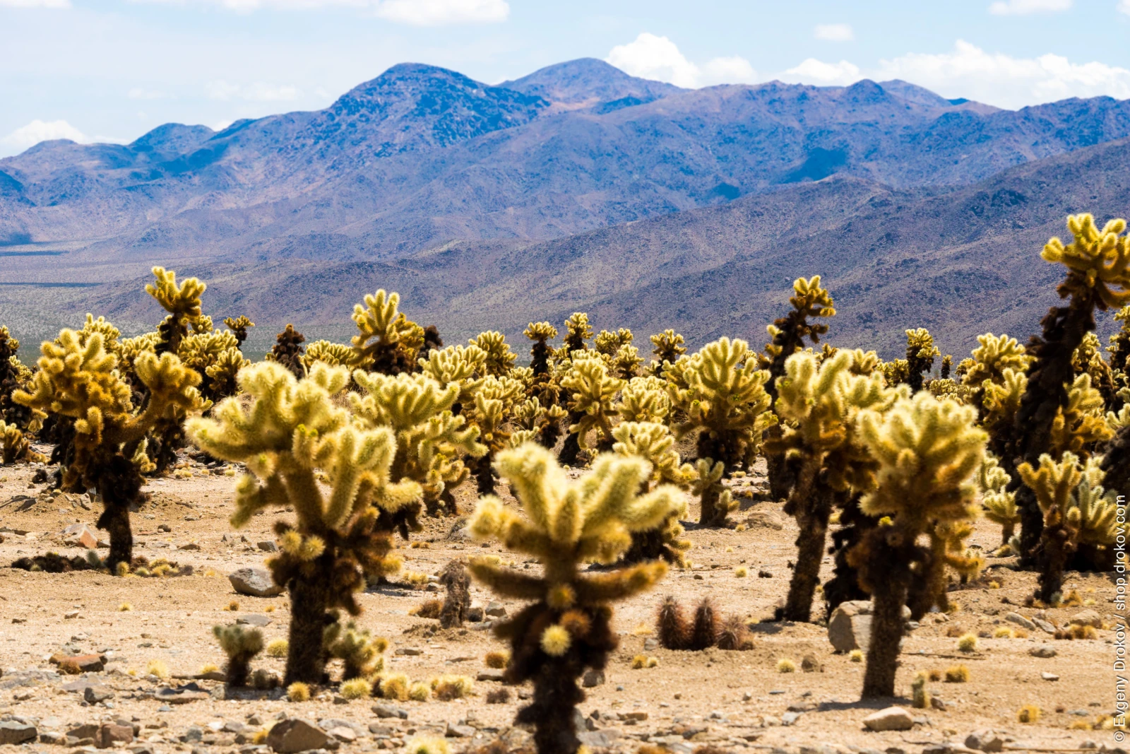 A dense cluster of cholla cacti stands in the foreground, their fuzzy spines catching the desert sun. In the background, the rugged mountains of Joshua Tree National Park, California, rise under a clear blue sky. This composition captures the unique flora and dramatic landscape of this iconic American desert.