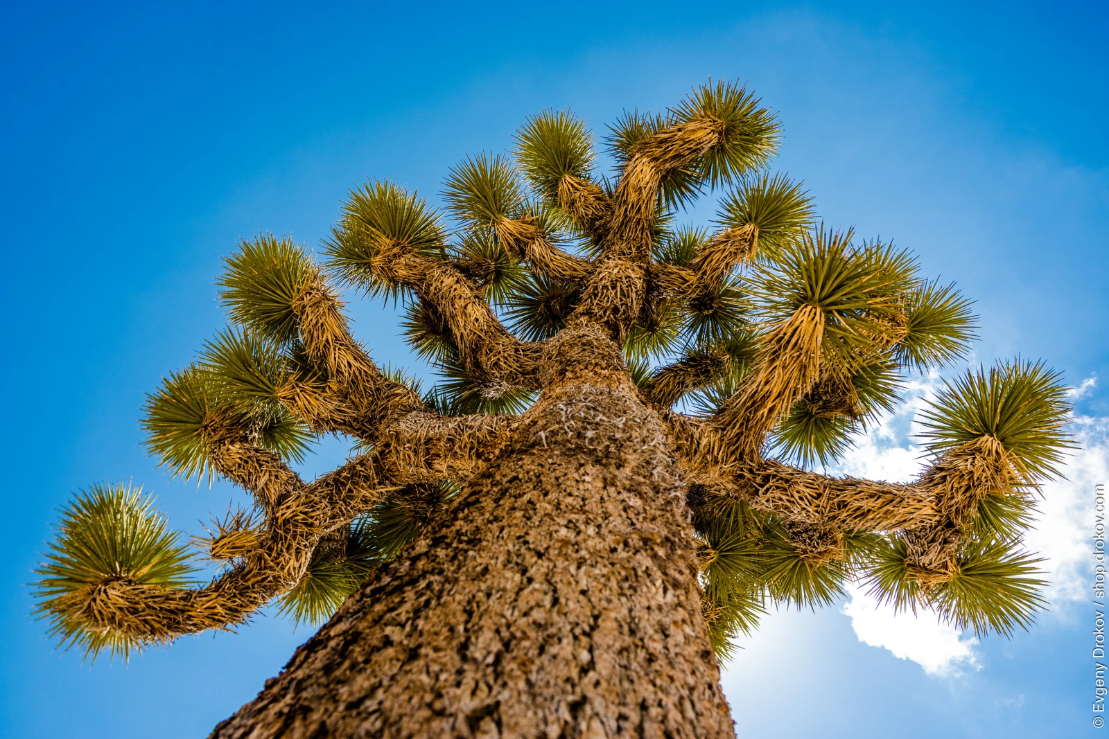 A Joshua Tree stands tall against a vibrant blue sky in Joshua Tree National Park, California. This iconic desert flora, captured from a low angle in Riverside County, showcases its unique branching structure and spiky leaves, a testament to its resilience in the arid landscape.