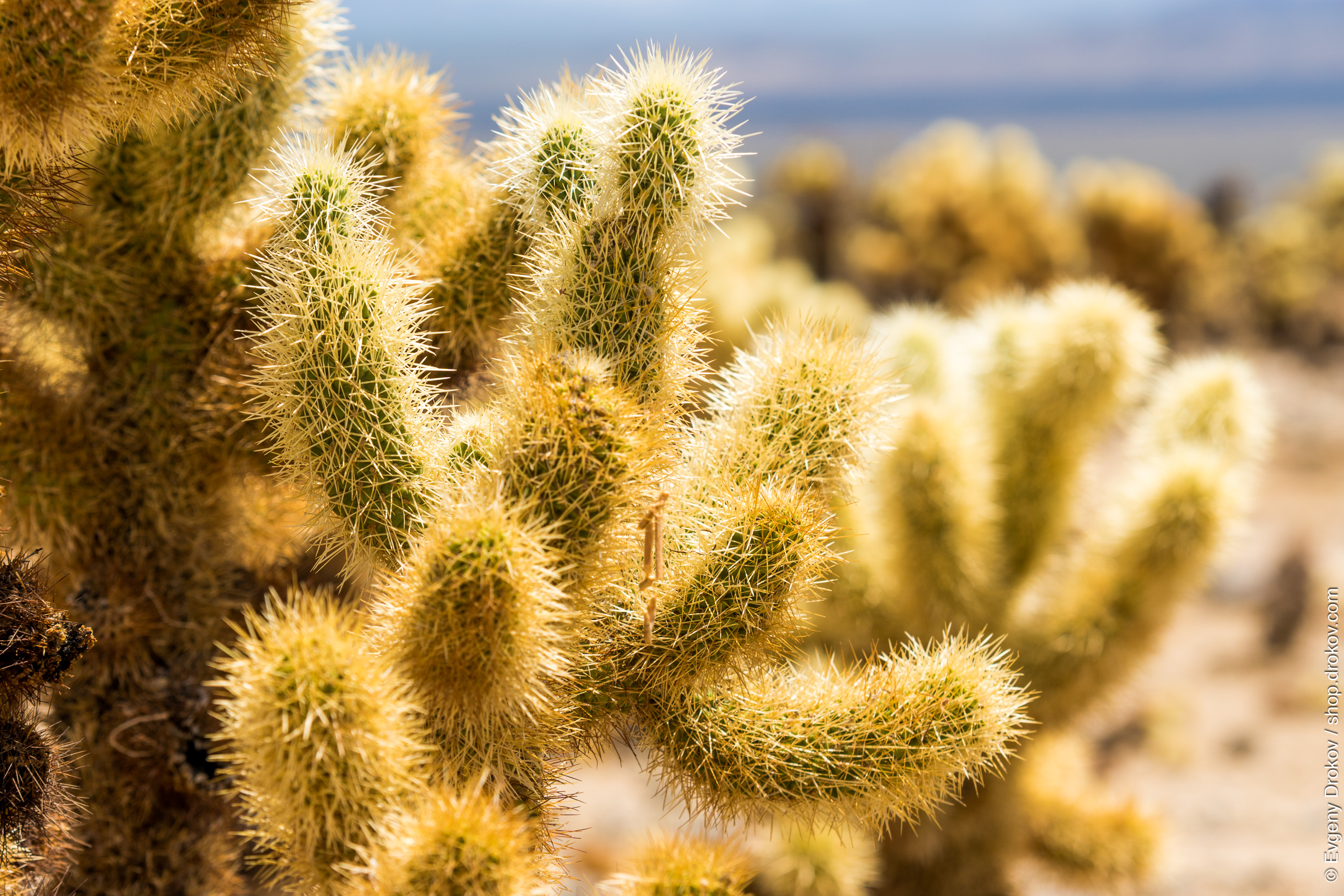 A close-up reveals the intricate spines of a cholla cactus in Joshua Tree National Park, California. This desert flora thrives in the arid landscape of Riverside County, showcasing nature's resilience and unique beauty.