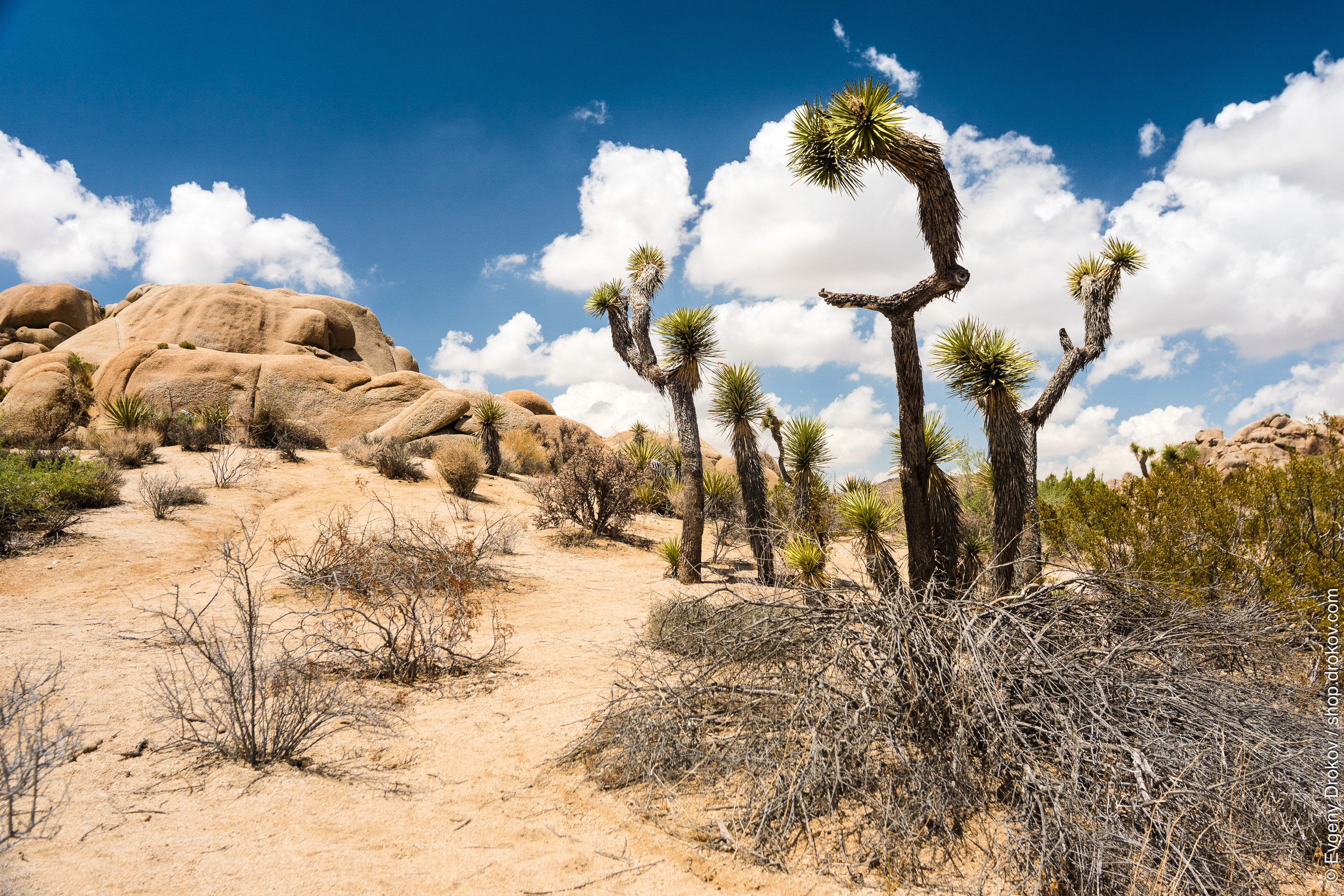 Joshua Tree National Park, California, USA, showcases the iconic Joshua Trees and unique rock formations under a bright blue sky. This natural wonder in Riverside County offers a stark, beautiful landscape.