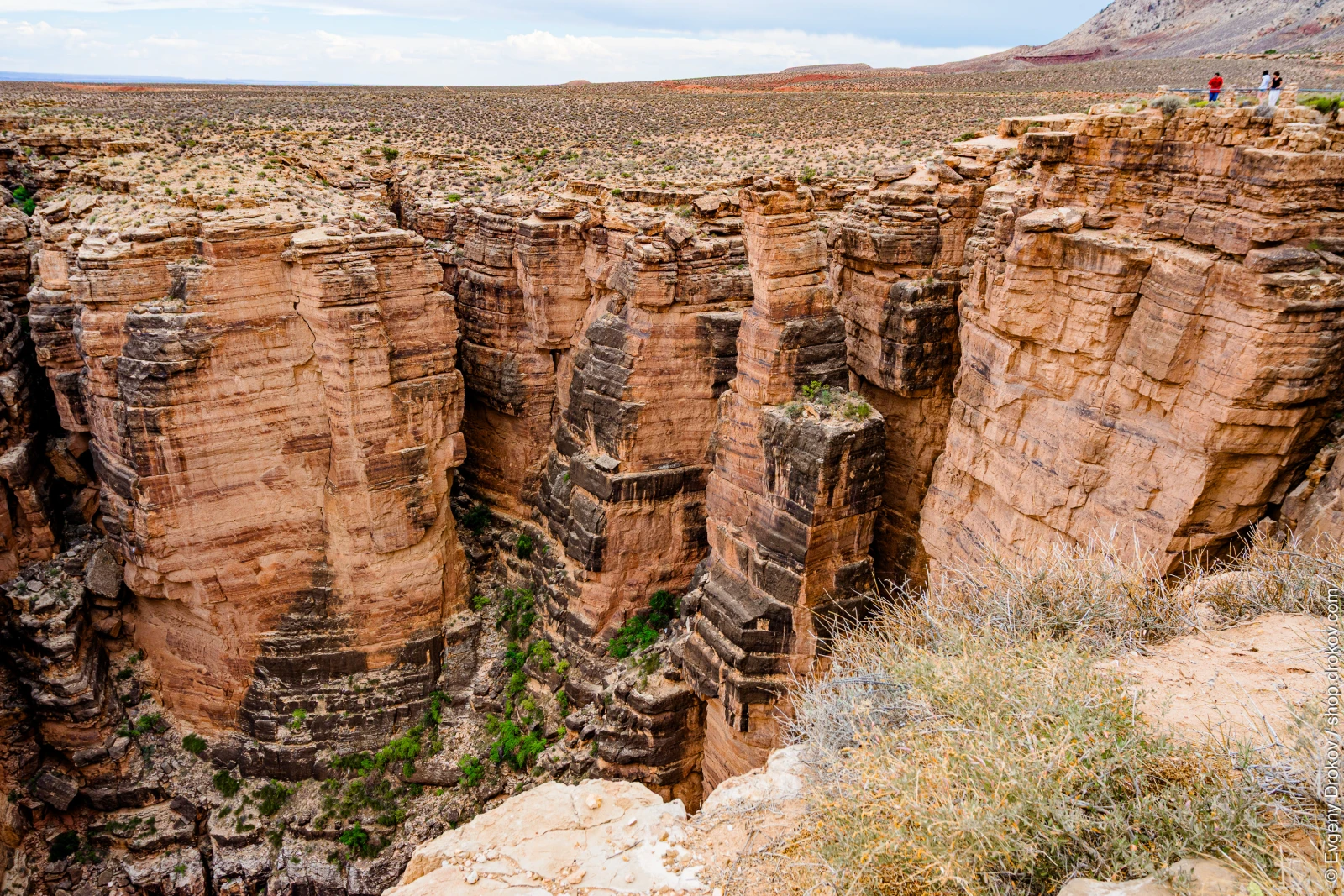 Two visitors admire the vastness of the Little Colorado River Gorge in Cameron, Arizona. This natural wonder showcases the powerful geological forces that shaped the landscape over millennia, offering a breathtaking vista of layered rock formations.