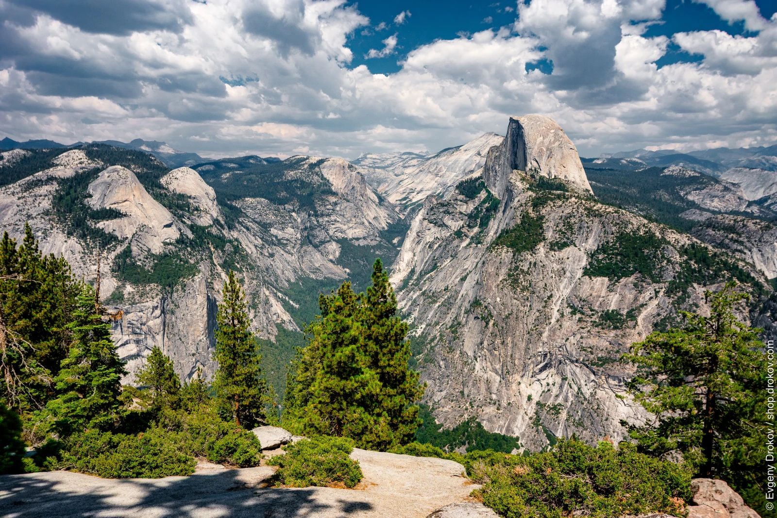This expansive vista captures the iconic Half Dome in Yosemite National Park, California, USA. The grandeur of the granite monolith and the surrounding valley showcases the raw, untamed beauty of nature, inspiring awe and a deep connection to the wilderness.
