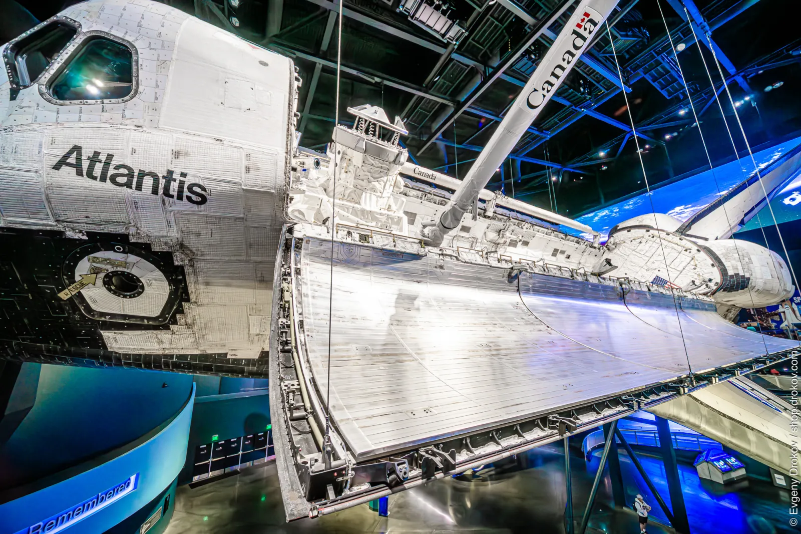 Space Shuttle Atlantis, a retired orbiter, is displayed at the Kennedy Space Center Visitor Complex in Merritt Island, Florida. This exhibit honors its legacy of space exploration and technological achievement. The view is from Titusville, Florida.