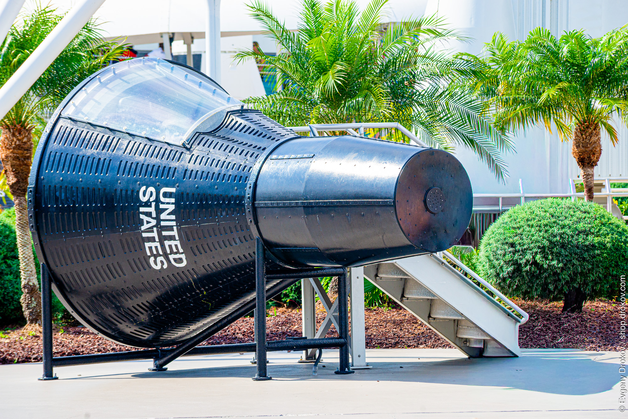 A Mercury capsule, a symbol of early American space exploration, is displayed at Kennedy Space Center Visitor Complex in Titusville, Florida. This exhibit honors the pioneering astronauts and the nation's commitment to reaching for the stars.
