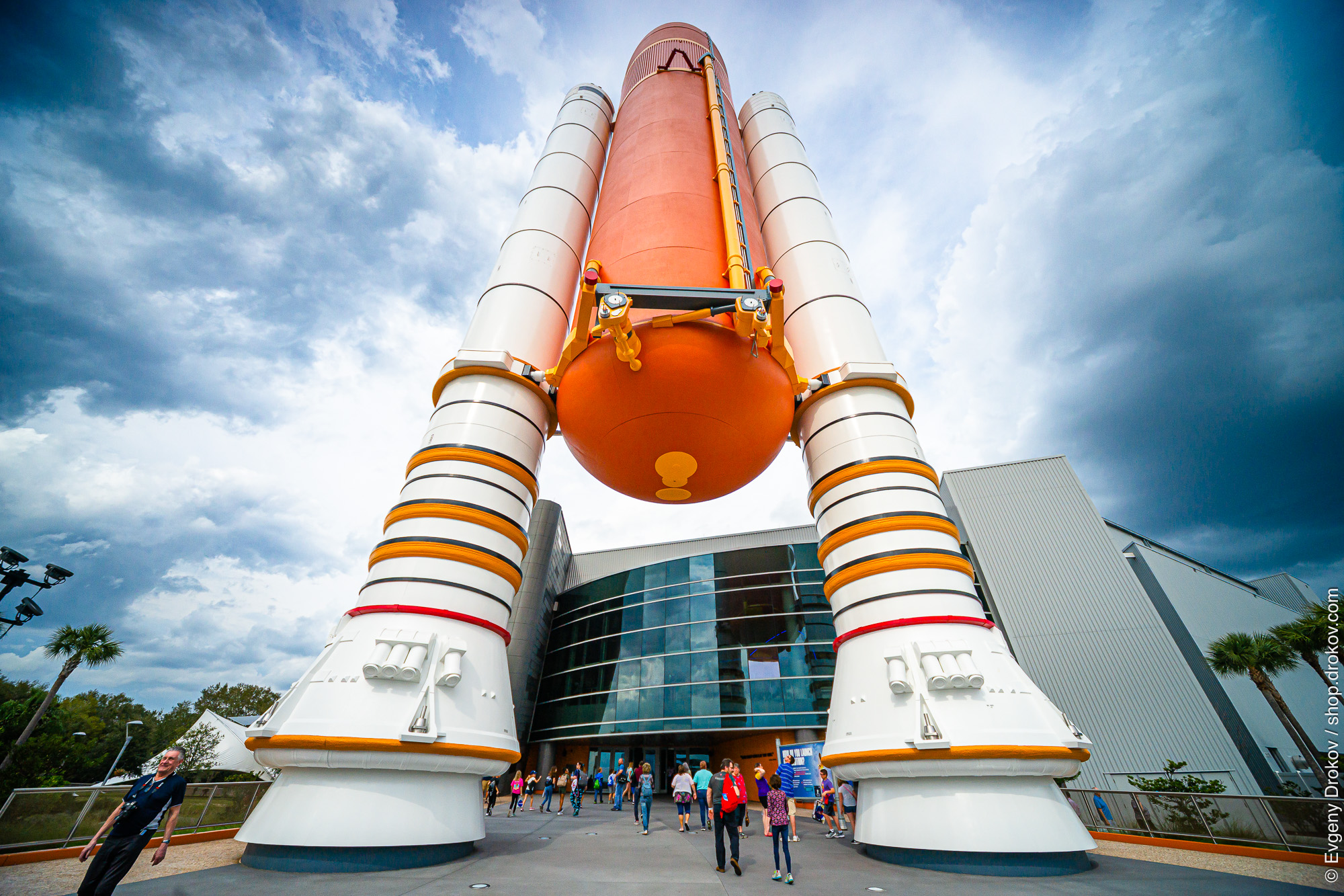 A massive space shuttle booster stands proudly at the entrance of the Kennedy Space Center Visitor Complex in Merritt Island, Florida. Visitors explore the historic artifact, a testament to human ingenuity in space exploration. The building's modern architecture provides a striking contrast to the powerful rocket.